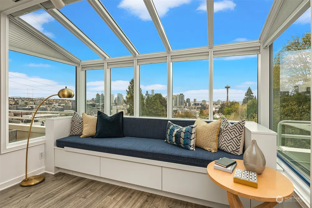 Ready for a view that will take your breath away? Welcome home to this show stopper- Over 1800 sq/ft top floor end unit! Numerous skylights & high ceilings allows natural light throughout. Custom kitchen remodel with HUGE 10.5 ft entertaining island, quartz counters & newer appliances. Charming built-in window seat is perfect to soak in the view. Large open living space w/ newer LVP flooring, gas fireplace & big deck. Massive primary suite with 5 piece bathroom, walk-in closet & private deck. Laundry room in unit plus loads of additional storage. Central A/C. Elevator, 2 secure parking spots & storage unit. Small boutique building with well run HOA. Close to Amazon, Climate Pledge, park, grocery, restaurants & more!